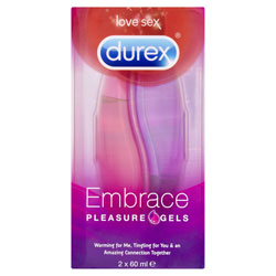 Category: Lubricants Code: 955-2920 Durex Embrace brings a new dimension to sex for both you and your partner with 2 sensual pleasure gels subtly crafted with couples in mind. For Me a silky gel with a warming sensation. For You an arousing gel with a tingling experience. And an amazing reaction when the two come together. Durex Embrace pleasure gels comes in a pack of two 60ml bottles. Brand: Durex Condoms