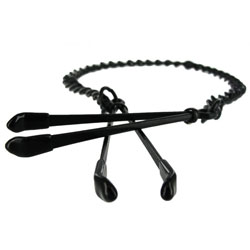 Look stylish while using these Black Nipple Tweezer Clamps. Made for nipple play, also works great on other parts of the body, these clamps go around each nipple and squeeze. You can control the amount of pressure you want by simply sliding either up or down on the ring. Tease and play with them as they try and anticipate just how much pressure you'll give them. Color: Black Brand: Master Series