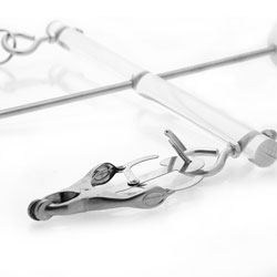 Category: Nipple Clamps Code: 955-1404 Take nipple play to the next level with The Tower of Pain. A simple yet very efficient design to help you squeeze and pull on your subs nipples. The Tower of Pain includes to two Japanese Clover Clamps at each end of clear rod. Once claps are attached to their nipples, place the rest plate ontop of there sternum and then screw in the ball rod and start stretching their nips! Simply turn the ball to pull the clear rod further away from their chest, making the clover clamps pull more. Keep them on the edge as they see you reach for the ball to turn it. Tower of Pain disassembles very easily for you to put away and put away or pack in your luggage. Color: Silver Brand: Kink Industries