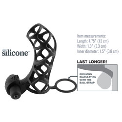 The Extreme Silicone Power Cage is the ultimate erection enhancer! With this cock cage wrapped snug around every inch of your manhood, you'll maintain rock hard erections and prolong the fun while you stimulate your partner. The ball strap prolongs ejaculation for explosive climaxes, while the cage leaves your cock open to feel every sensation and still enjoy the natural touch of your lover. You'll enjoy thick, throbbing erections and your partner will love the cage's added sensations. The vibrating clit stimulator delivers direct stimulation to their most sensitive spot. Just one click of the powerful waterproof micro vibe and you'll make them cum harder than ever before!