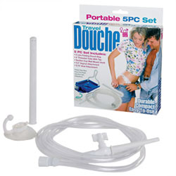 Category: Personal Hygiene Code: 955-2756 Travel Douche, 5 Piece Set with Vaginal & Anal Attachments. Set Includes 2 Litre Folding Douch Bag 4 Inch Threaded Tube with Tap Suction Cup Wass Mount Hook 5.5 Inch Vaginal Attachment 2.75 Anal Attachment Very Duragble, compact and all easy to use Color: White Brand: Seven Creations