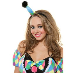 2 piece clown outfit, dress with puff sleeves and head band 89 percent polyester and 11 percent spandex