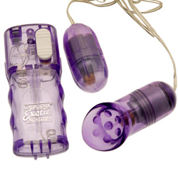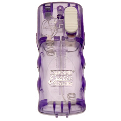Category: Stimulators Code: 955-2516 Get twice the sensual pleasure with 2 interchangeable stimulators, a powerful vibrating bullet and textural vibrating contoured clit cup. Plug into the 2 speed power pak for an incredibly erotic delight. Color: Purple Brand: California Exotic